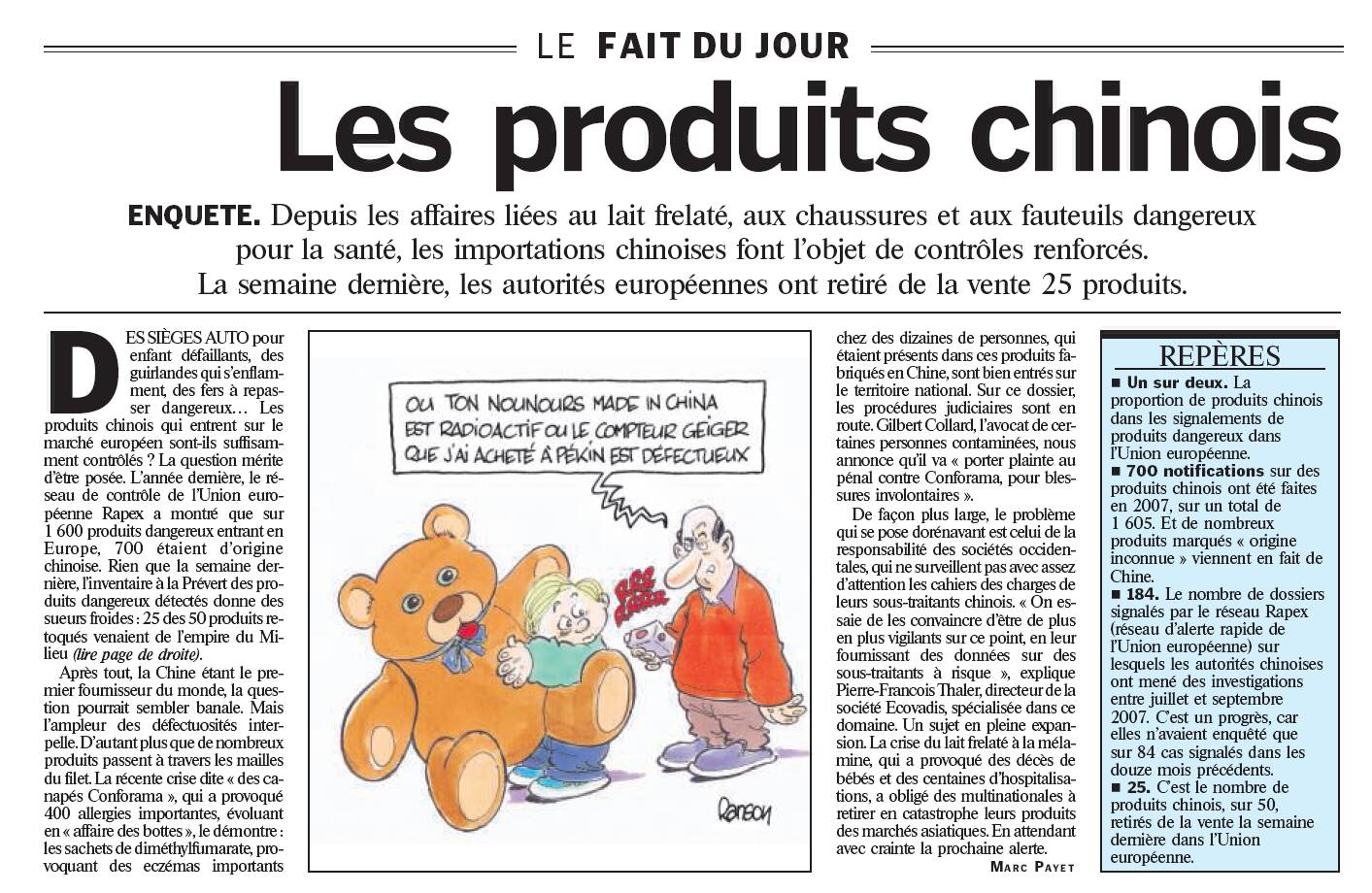 La Chine est un monstre qui dans l’impunité totale, ne respecte rien : ni les droits de l’homme, ni l’environnement, ni les normes sur la qualité et la sécurité de ses produits. Il faut boycotter au maximum TOUS les produits " made in China " et particulièrement les produits alimentaires.Signe des temps, certaines étiquettes commencent à renseigner "China Free" et "Not made in China"...