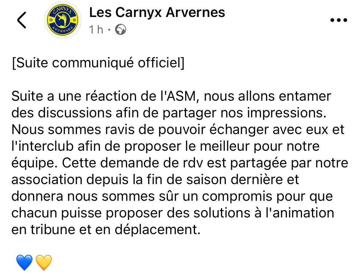 Vu sur FB communiqué du groupe de supporters des Carnyx Arvernes :