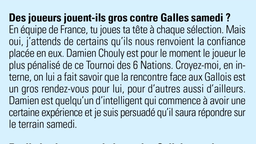 "Merci à tous et à toutes pour avoir participé et posé vos questions. Encore une fois, on aura besoin de tout le monde, samedi, de votre soutien. Quand on joue au Stade de France, on sent le public derrière nous. Parfois, ça donne un supplément d'énergie dans les moments difficiles. On aborde les Gallois avec de la détermination et de l'enthousiasme. On va essayer de se lâcher en étant tous branchés sur la même longue d'onde.