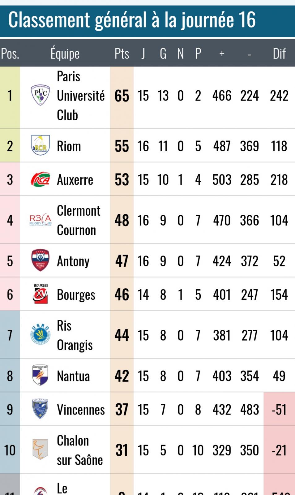 Très belle performance, effectivement de CLERMONT-COURNON; moins bonne de RIOM à NANTUA ; mais au global une excellent parcours après 17 journées. Seule interrogation,nos deux représentants ont 1, voir 2 matchs de plus que PARIS, AUXERRE et BOURGES; leurs principaux rivaux . A suivre..............