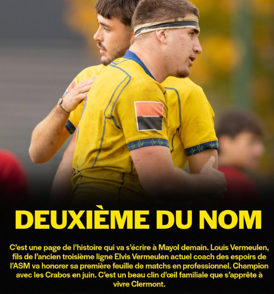 Dans la famille Vermeulen, je demande le fils ! Douze ans après le dernier match du père Elvis sous le maillot de l’ASM, Louis va connaître ce samedi soir, à Toulon, sa première apparition sous la tunique « jaune et bleu ». Avec les mêmes qualités et traits de caractère.